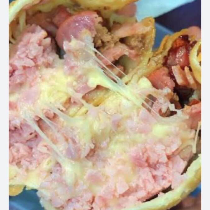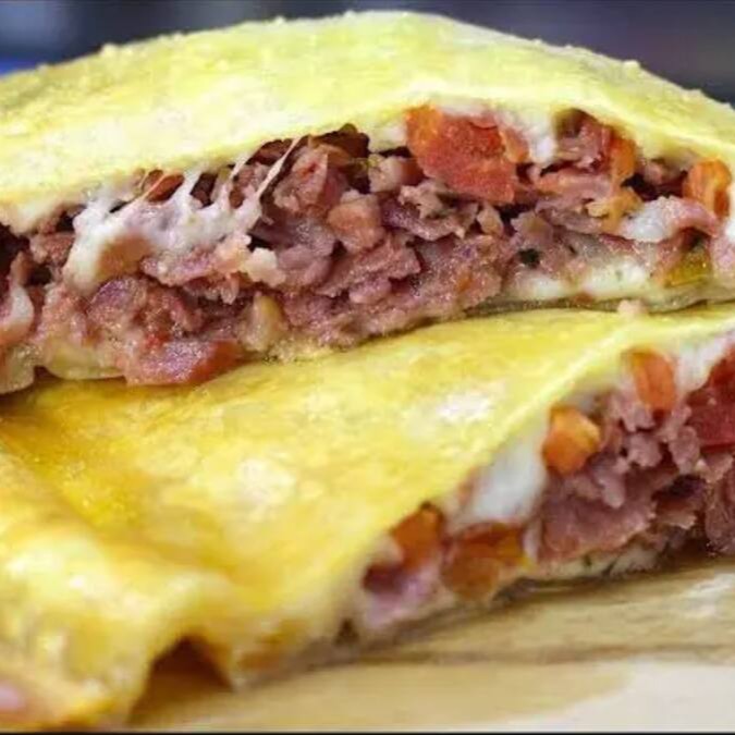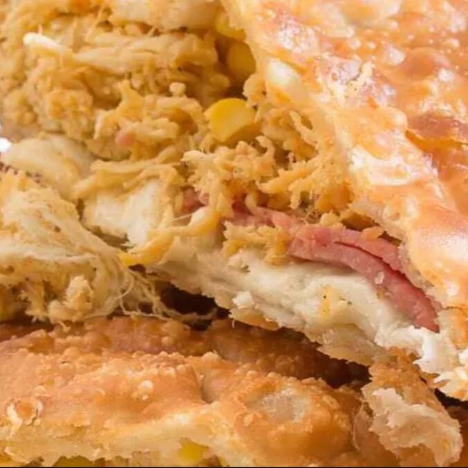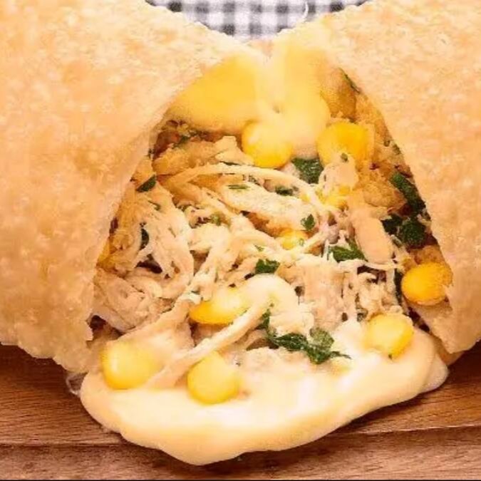 Frango temperado, carne moída, salsicha, milho e queijo mussarela
