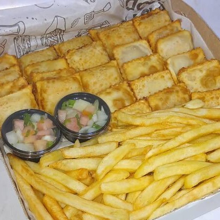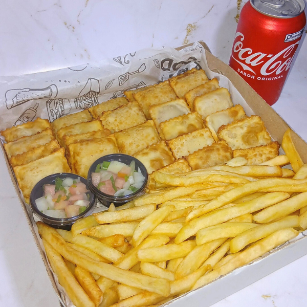20 mini pastéis sortidos (queijo e presunto, calabresa, carne moída, frango), super crocantes, + 300g de batata frita sequinha + 2 molhos da casa irresistíveis. Ideal para 1 ou 2 Pessoas Sabores enviados conforme disponibilidade.