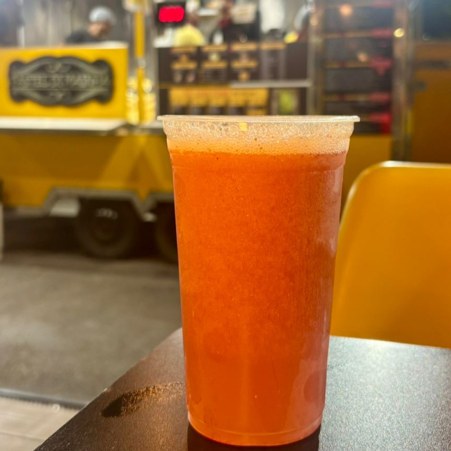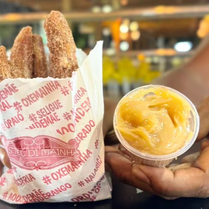 01 caldo de cana com morango 500 ml + 01 pastel de carne seca com bacon, banana frita, tomate seco e coalho + churros espanhol com doce de leite 6 und