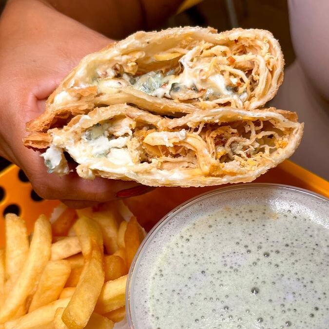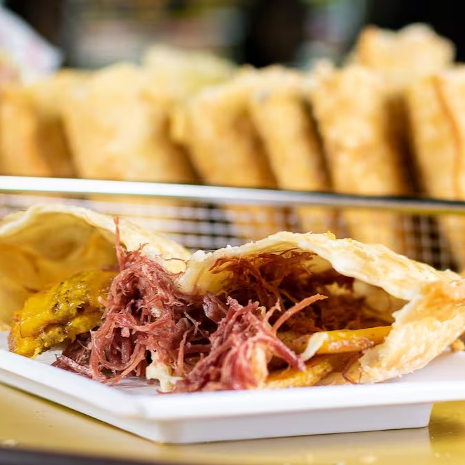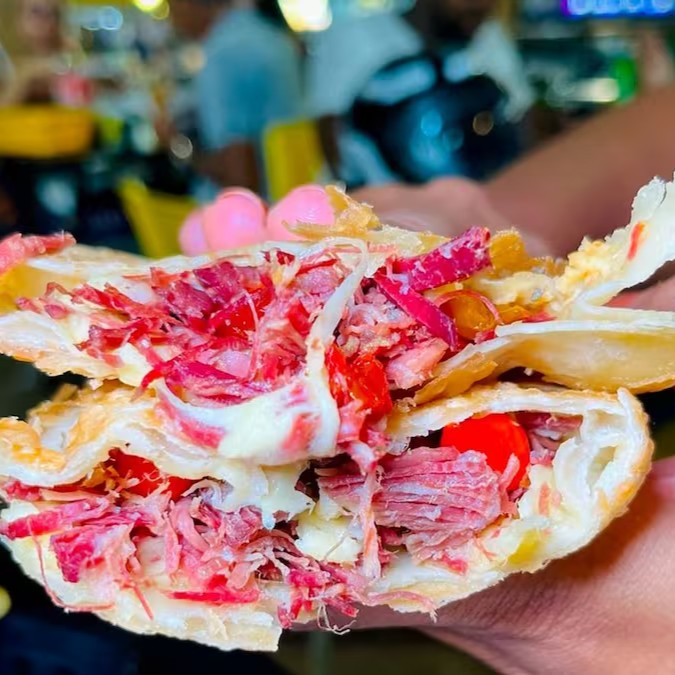 Carne do sol, banana frita e cream cheese. Atenção alérgicos: contém derivados do leite da vaca.