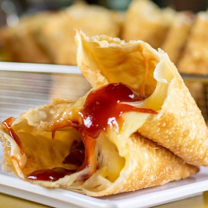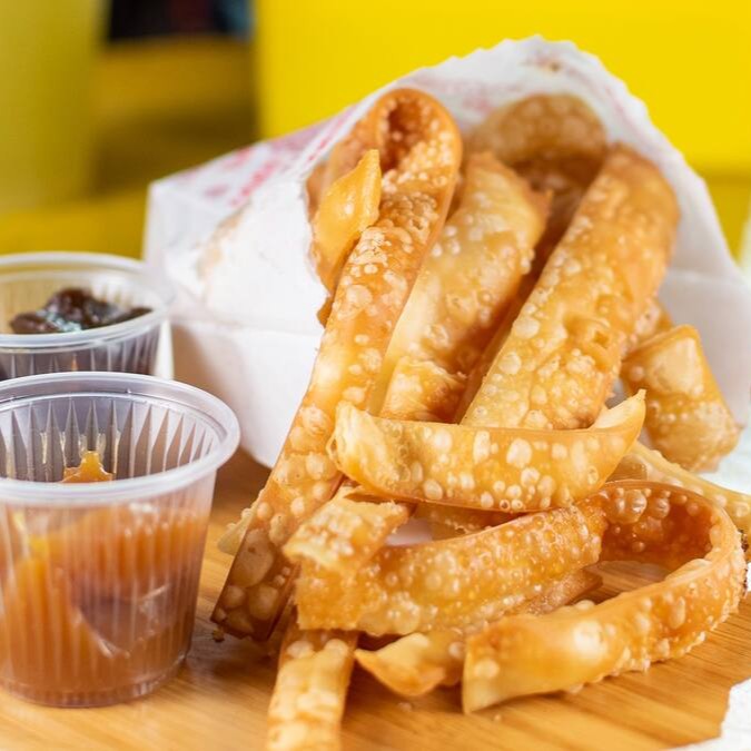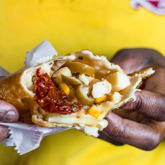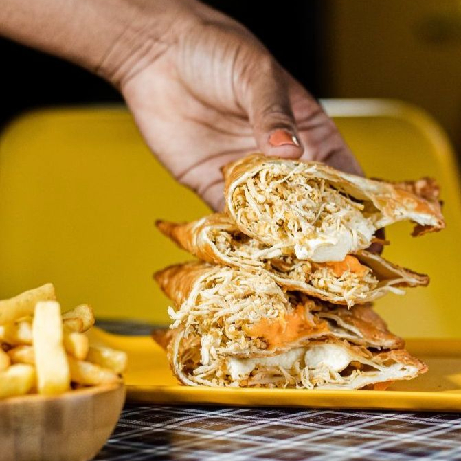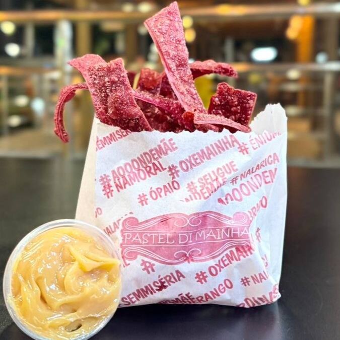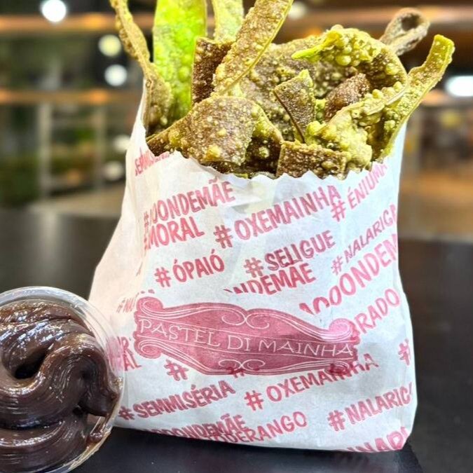 Massa do pastel sabor pimenta cortada em tiras. Acompanha calda de chocolate