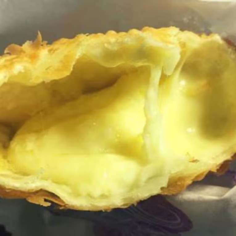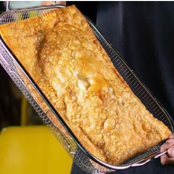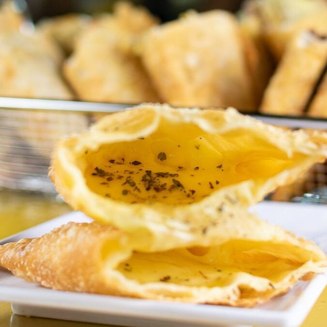 Massa do pastel sabor ervas finas cortada em tiras. Acompanha calda de doce de leite