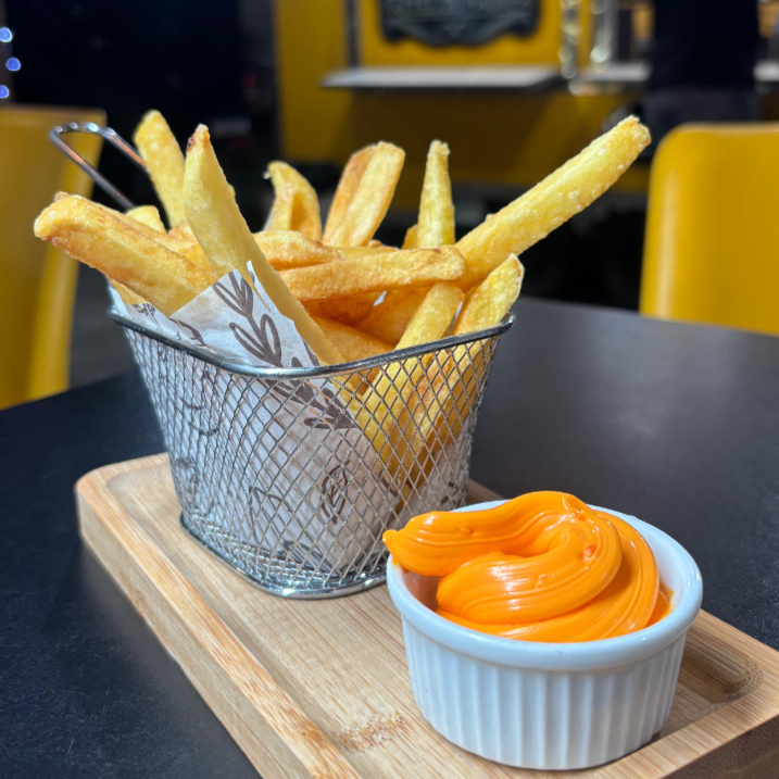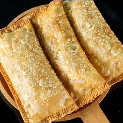 Massa do pastel sabor ervas finas cortada em tiras. Acompanha calda de chocolate