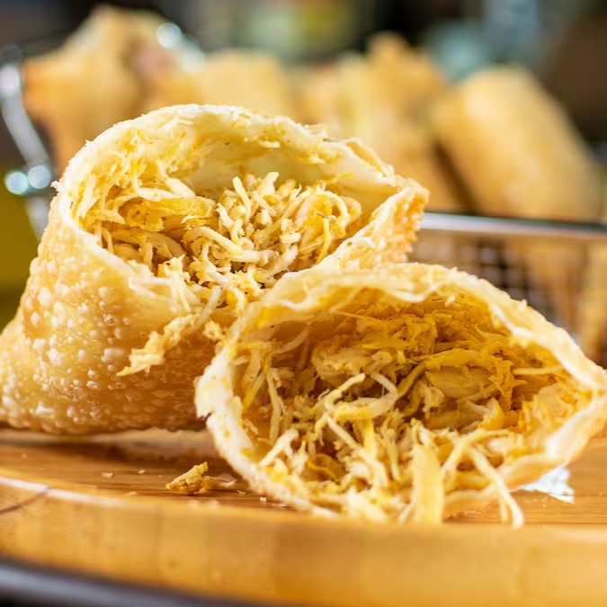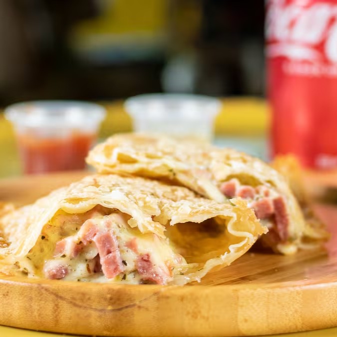 Frango desfiado e Catupiry. Atenção alérgicos: contém derivados do leite da vaca.