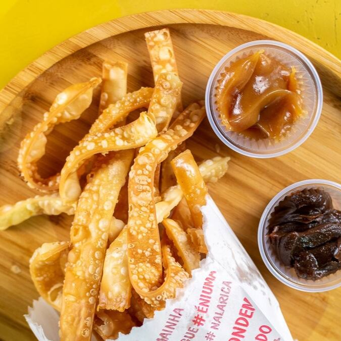 Massa do pastel sabor pimenta cortada em tiras. Acompanha calda de doce de leite