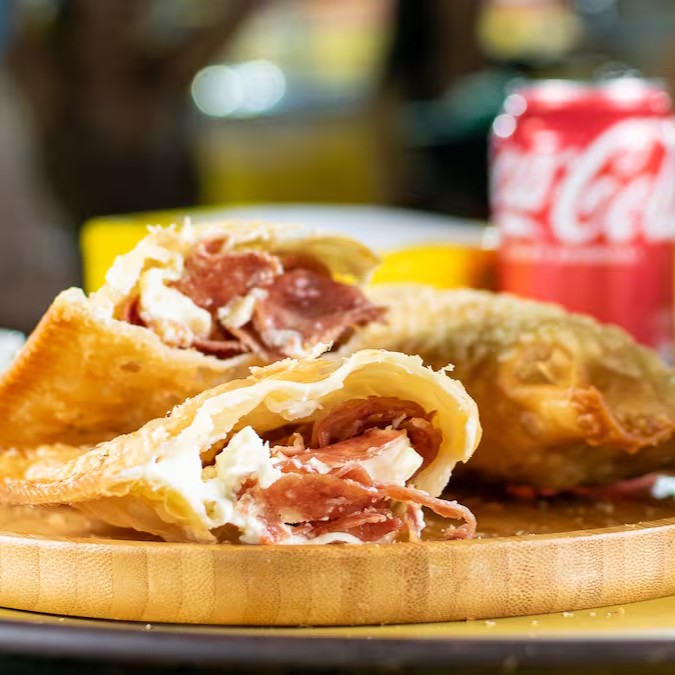 Combo 05 - Pastel De Carne Seca, Bacon, Banana, Tomate Seco E Queijo Coalho + Caldo Com Morango 500ml + Churros Espanhol