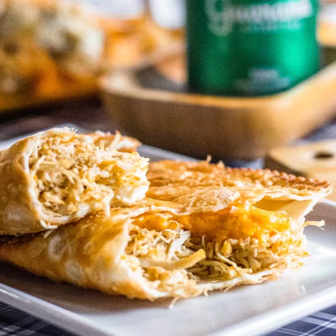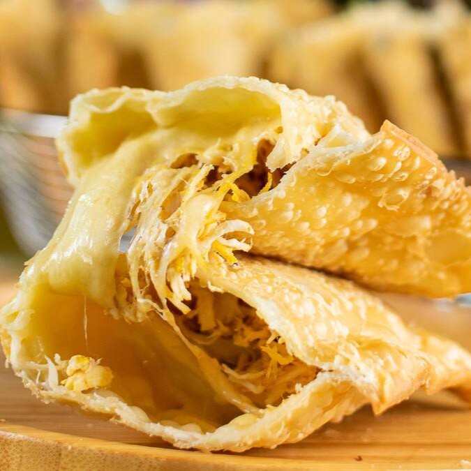Frango desfiado e cheddar. Atenção alérgicos: contém derivados do leite da vaca.