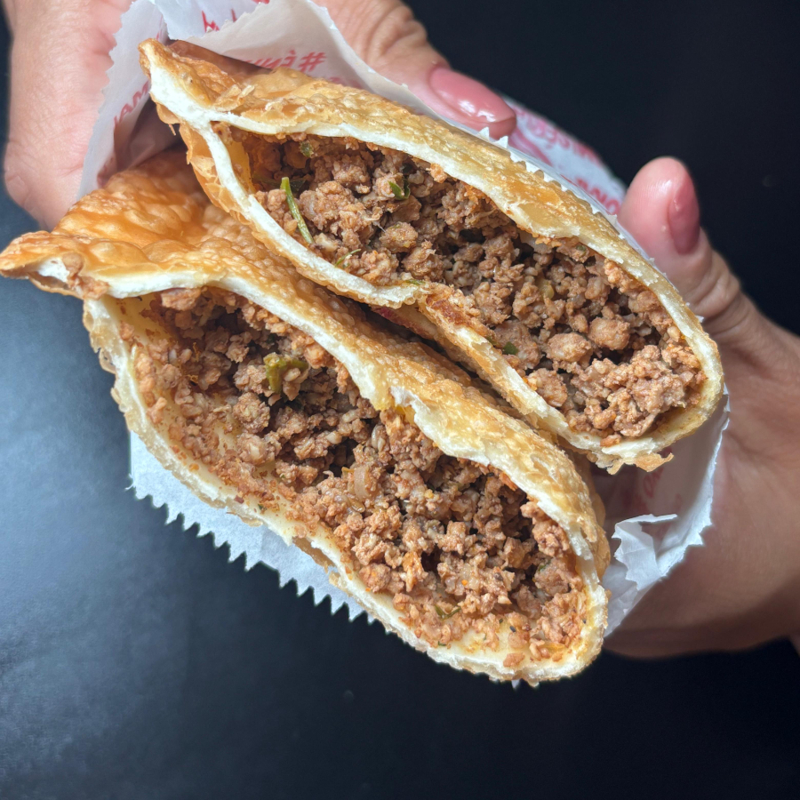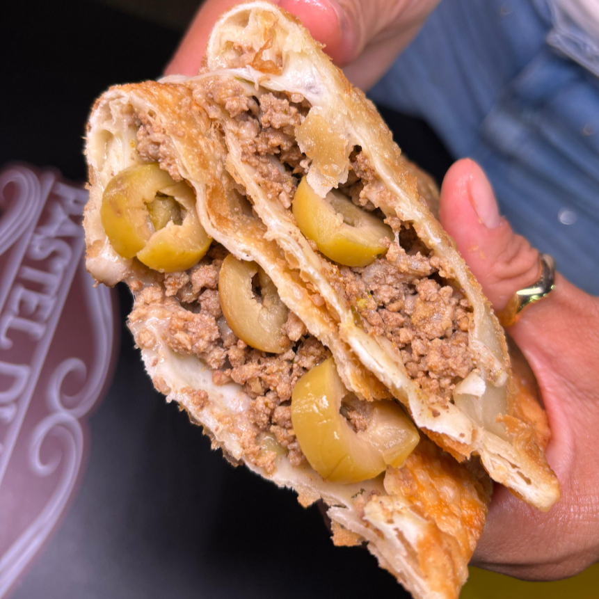 Carne moída, queijo mussarela e azeitona. Atenção alérgicos: contém derivados do leite da vaca.