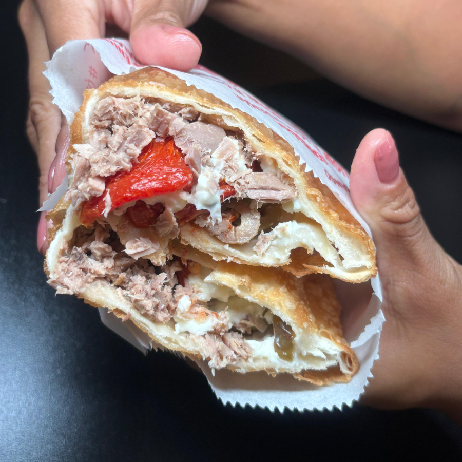 Atum, queijo mussarela, cebola e pimenta biquinho. Atenção alérgicos: contém derivados do leite da vaca.