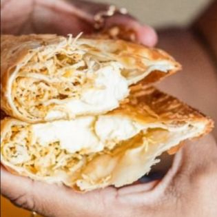 Frango desfiado e cream cheese. Atenção alérgicos: contém derivados do leite da vaca.