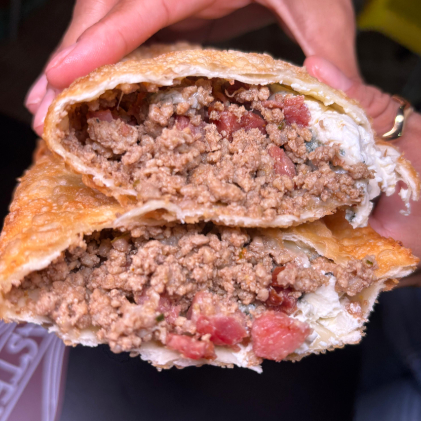 Carne moída, palmito, cream cheese. Atenção alérgicos: contém derivados do leite da vaca.