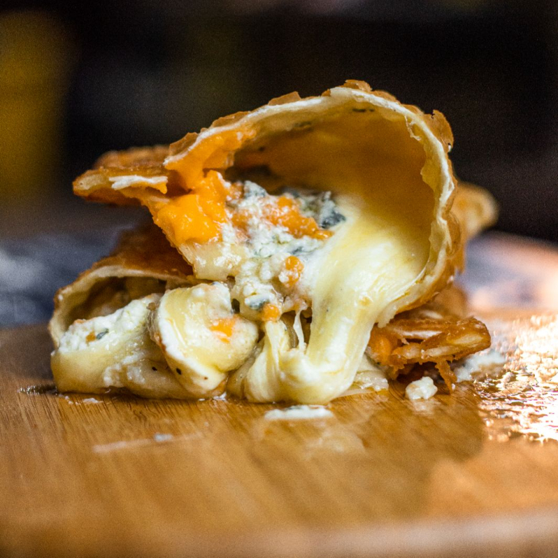 Frango desfiado, gorgonzola, cream cheese e pimenta calabresa. Atenção alérgicos: contém derivados do leite da vaca.