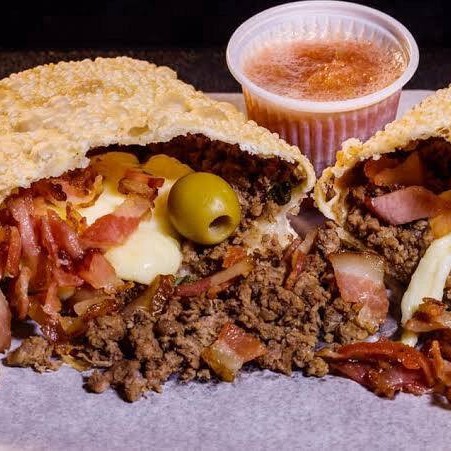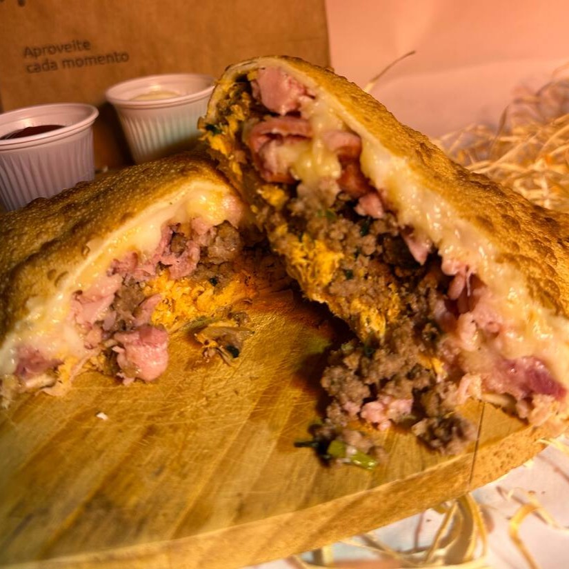 Pão, Blend de Carne 160g, Queijo Cheddar Derretido, Bacon, Cebola Empanada e o Tempero Baiano Molho Apimentado