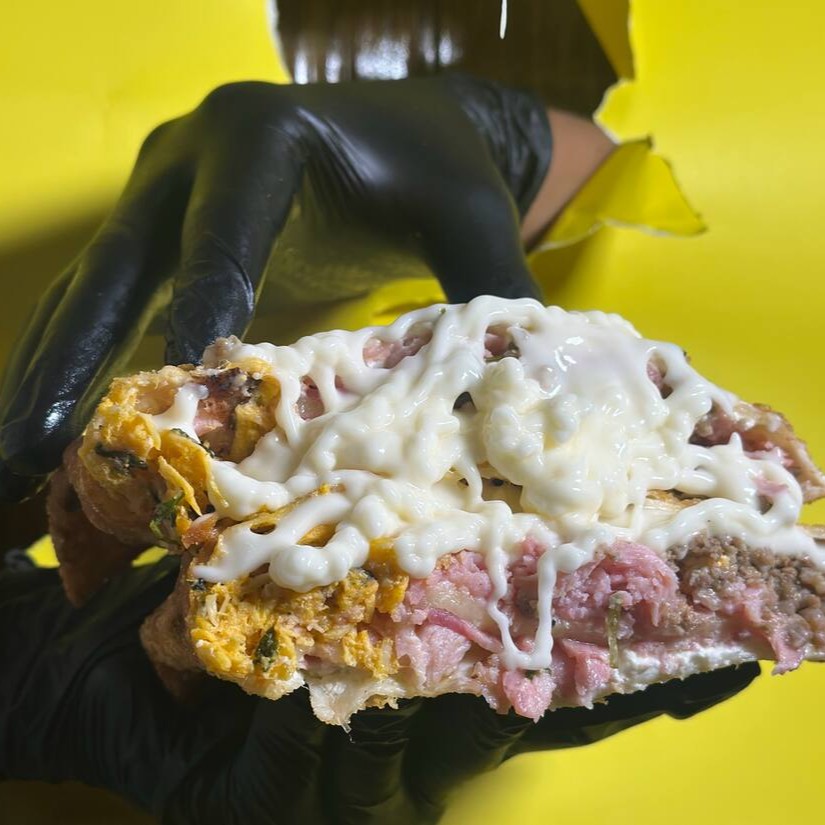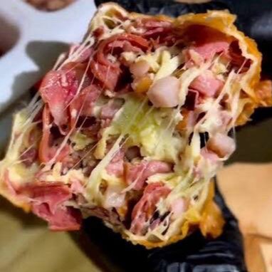 EFRANGO DESFIADO, CARNE , BACON, CALABRESA, PRESUNTO, BANANA DA TERRA, CATUPIRY (ORIGINAL) E MUSSARELA.
