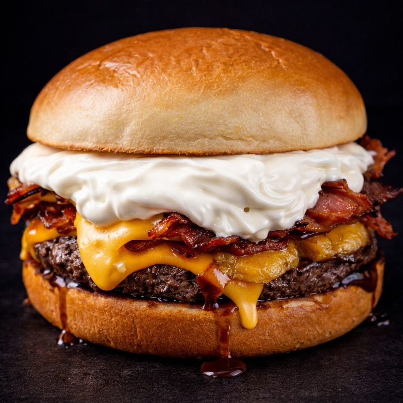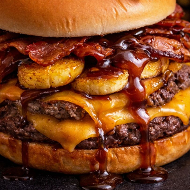 Pão, 2x Blend de Carne (100g cada), 2x Queijo Cheddar Derretido, Bacon, Cebola Empanada, um equilíbrio de Banana da Terra e o mais perfeito Molho Especial.