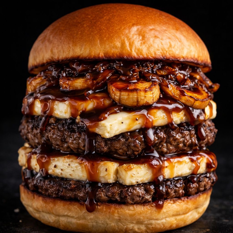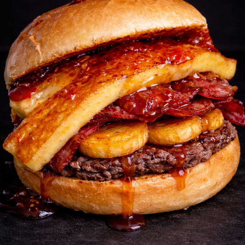 Pão, 2x Blend de Carne (100g cada), 2x Queijo Coalho fatiado, Melaço, Banana da Terra e o saborioso Molho Especial