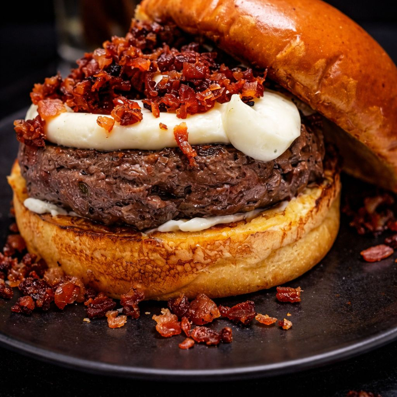 Pão, Blend de Carne (160g), Queijo Cheddar Derretido, Cebola Caramelizada, Creme Cheese e o poderoso Bacon