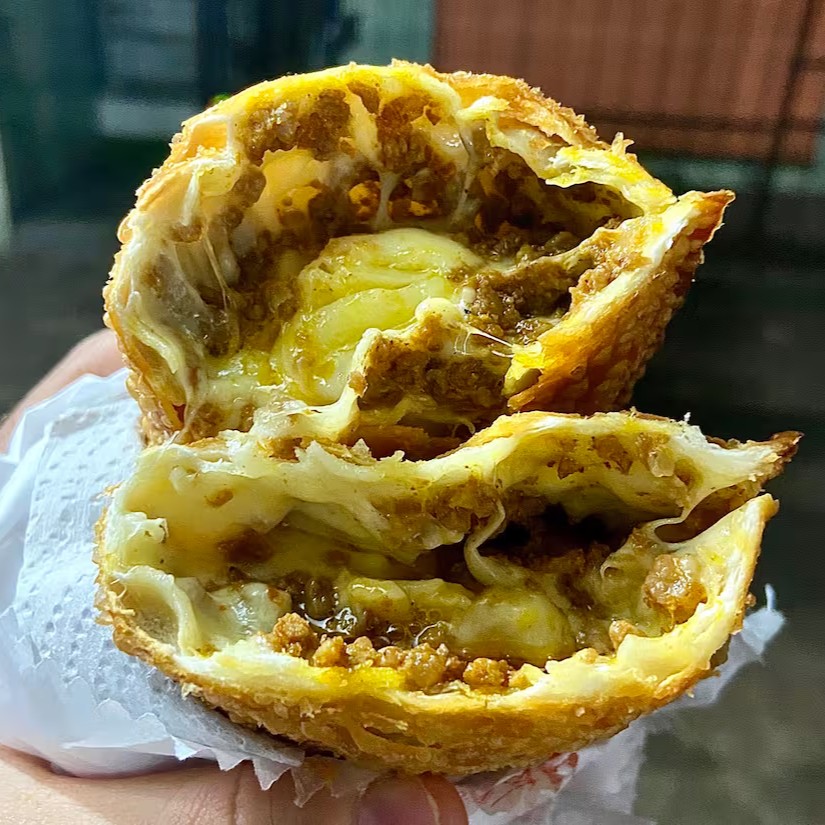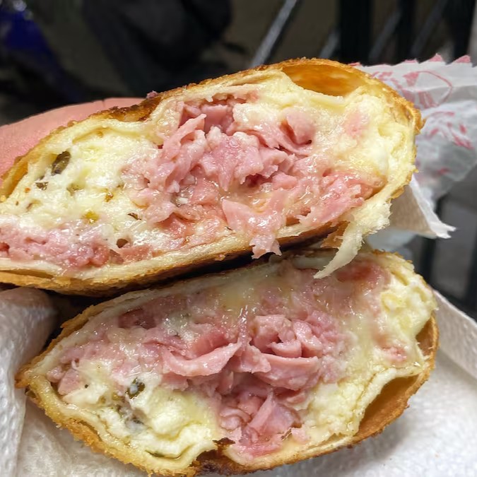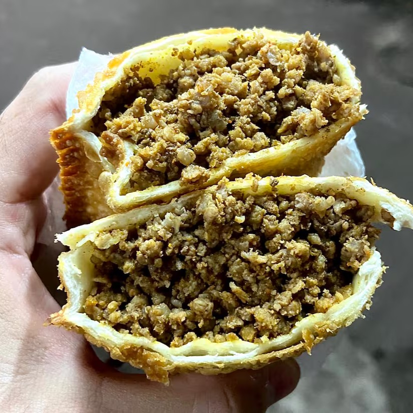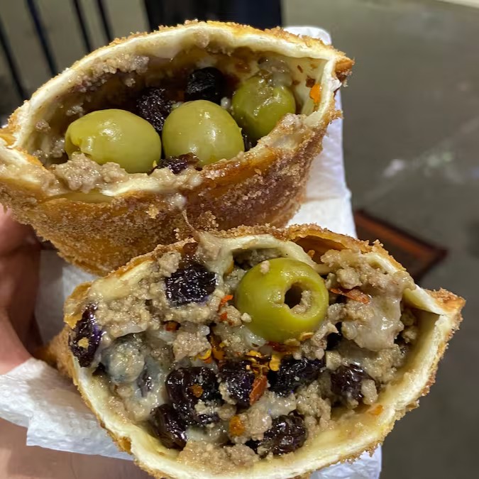 Carne, queijo, azeitona, passas, pimenta calabresa e massa no açucar e canela
