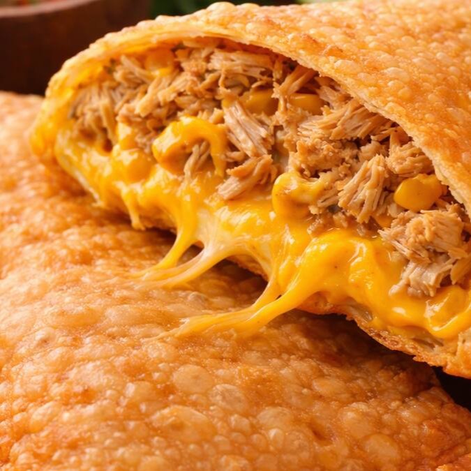 Pastel de frango com cheddar com massa crocante e dourada, recheado com frango bem temperado e cheddar cremoso, unindo suculência e sabor intenso na medida certa.