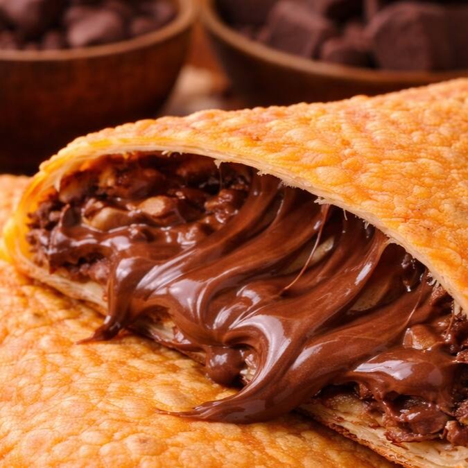 Pastel de chocolate com avelã, com massa crocante e dourada, recheado com chocolate cremoso e derretido, trazendo um contraste perfeito entre o salgado da massa e o doce intenso do recheio.