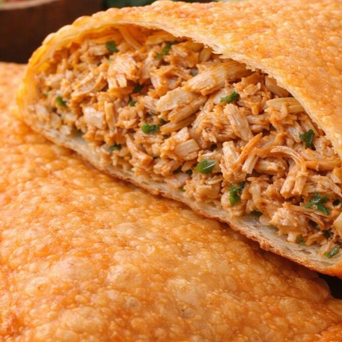 Pastel de frango com massa dourada e crocante, recheado com frango bem temperado, suculento e desfiado na medida certa. Sabor caseiro, direto ao ponto: leve, salgado na medida e perfeito pra matar a fome!