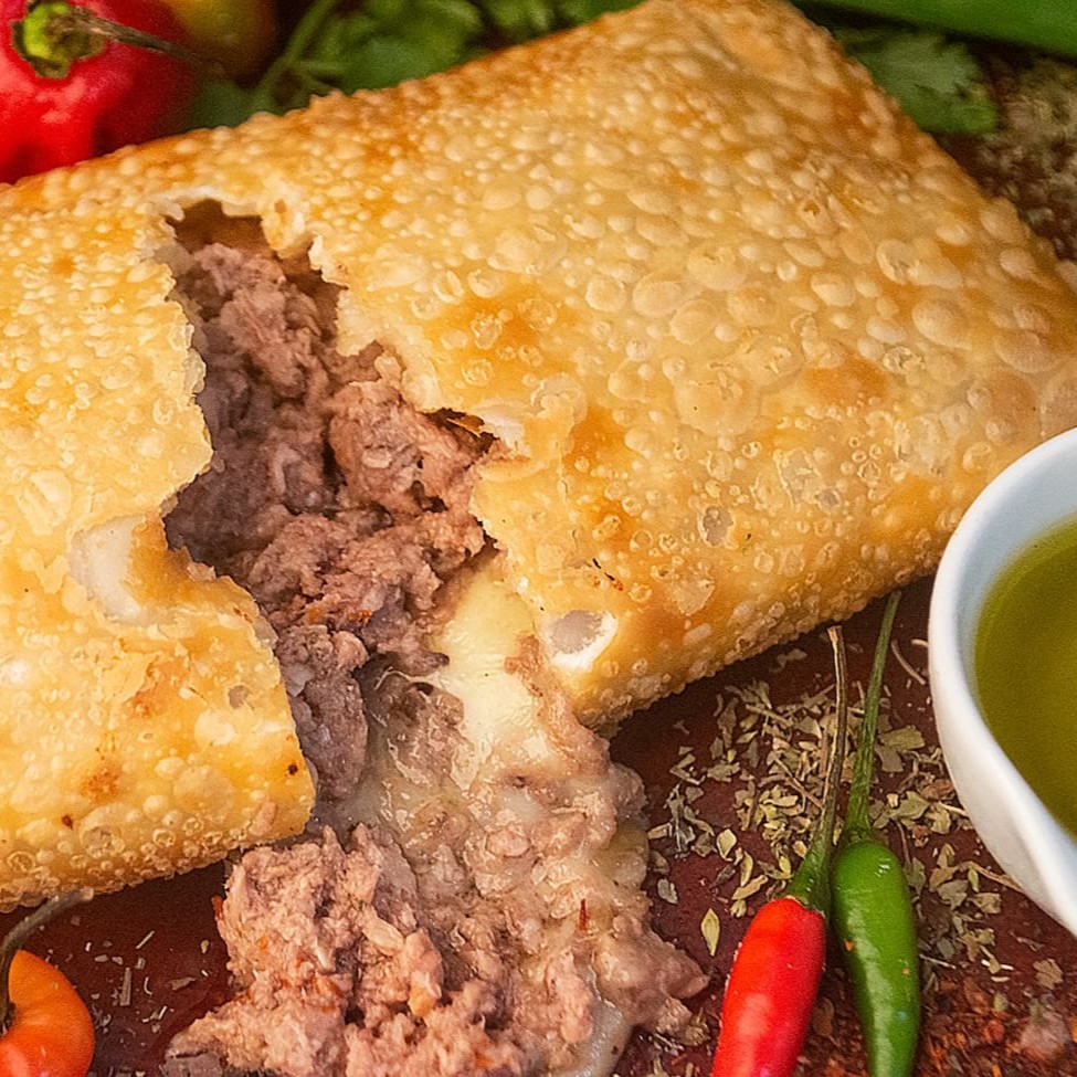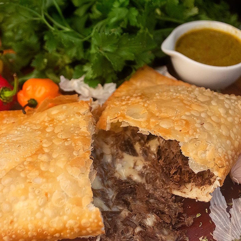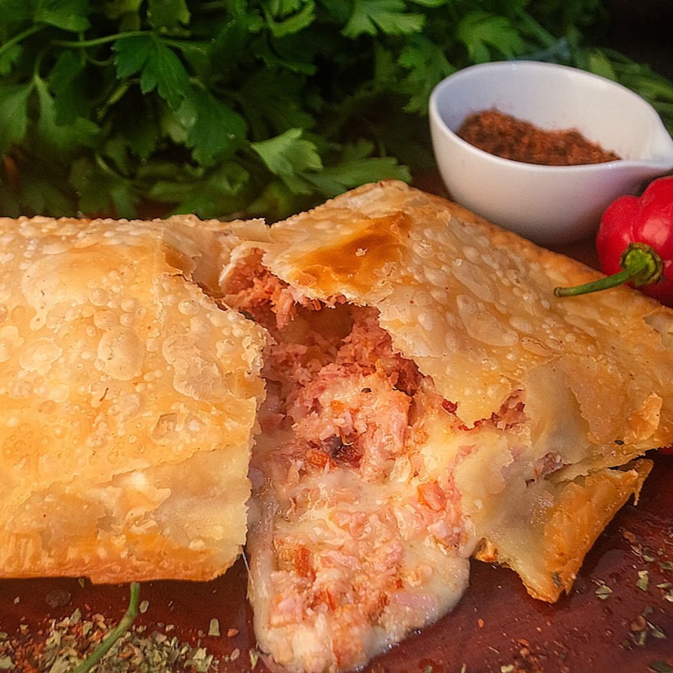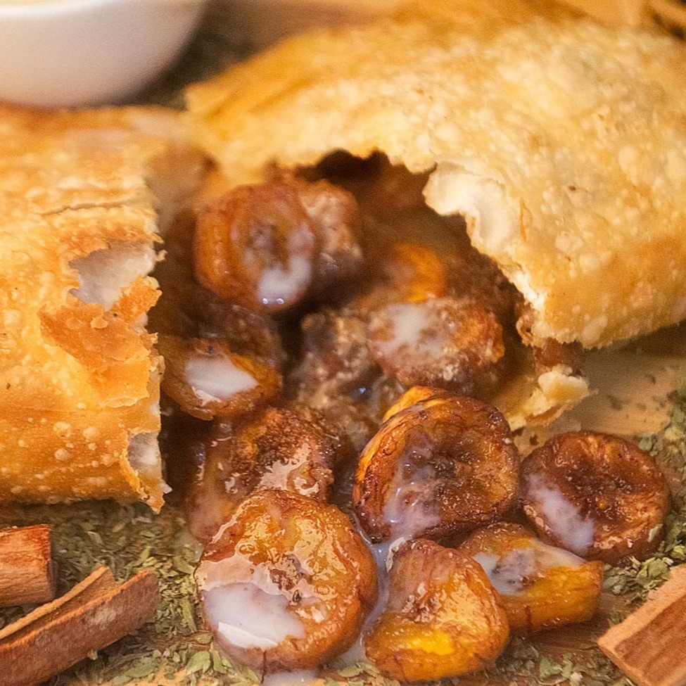 Pastel de carne seca desfiada, queijo coalho e banana da terra frita