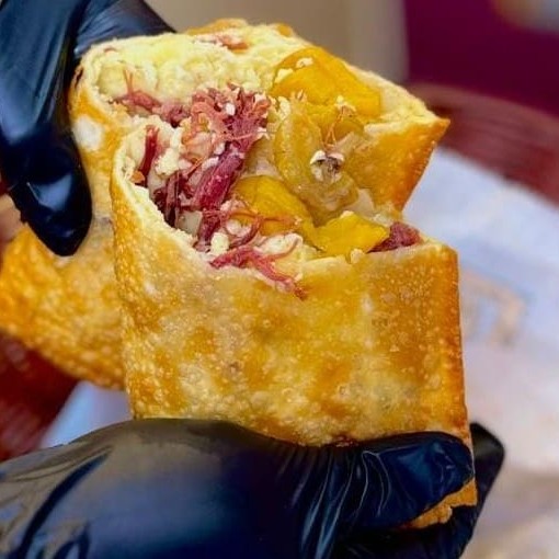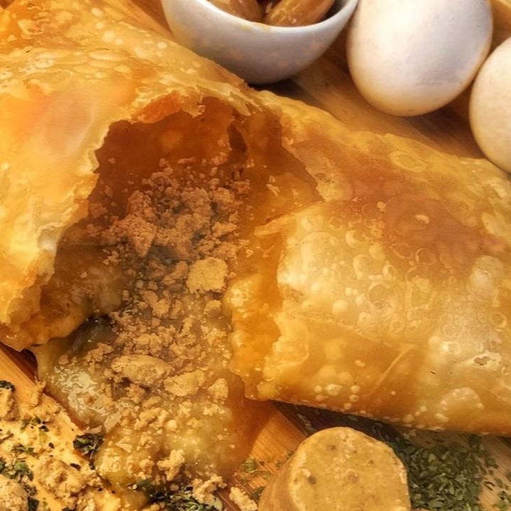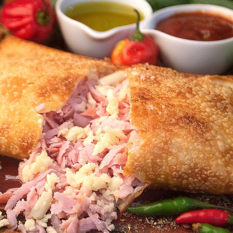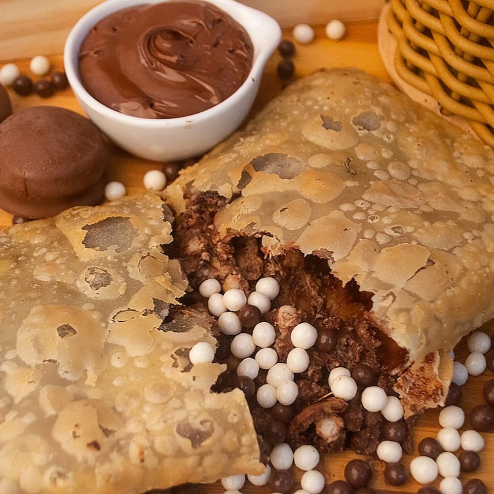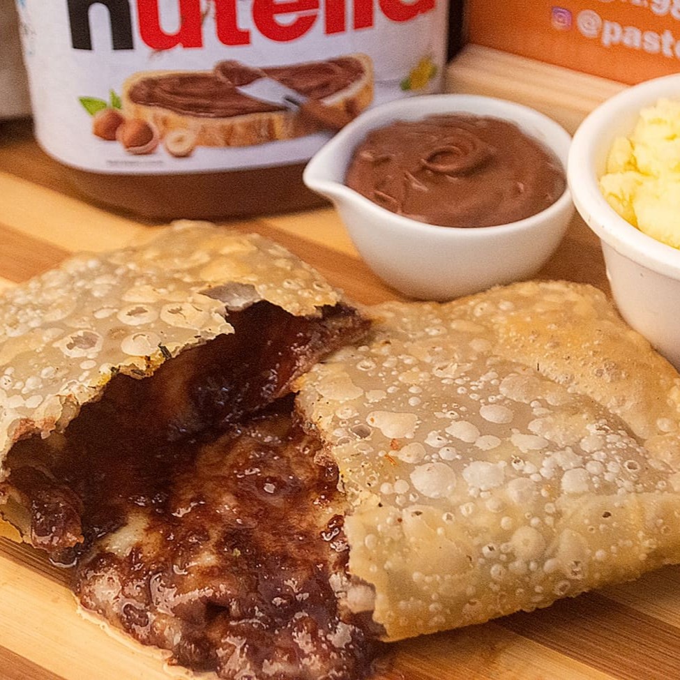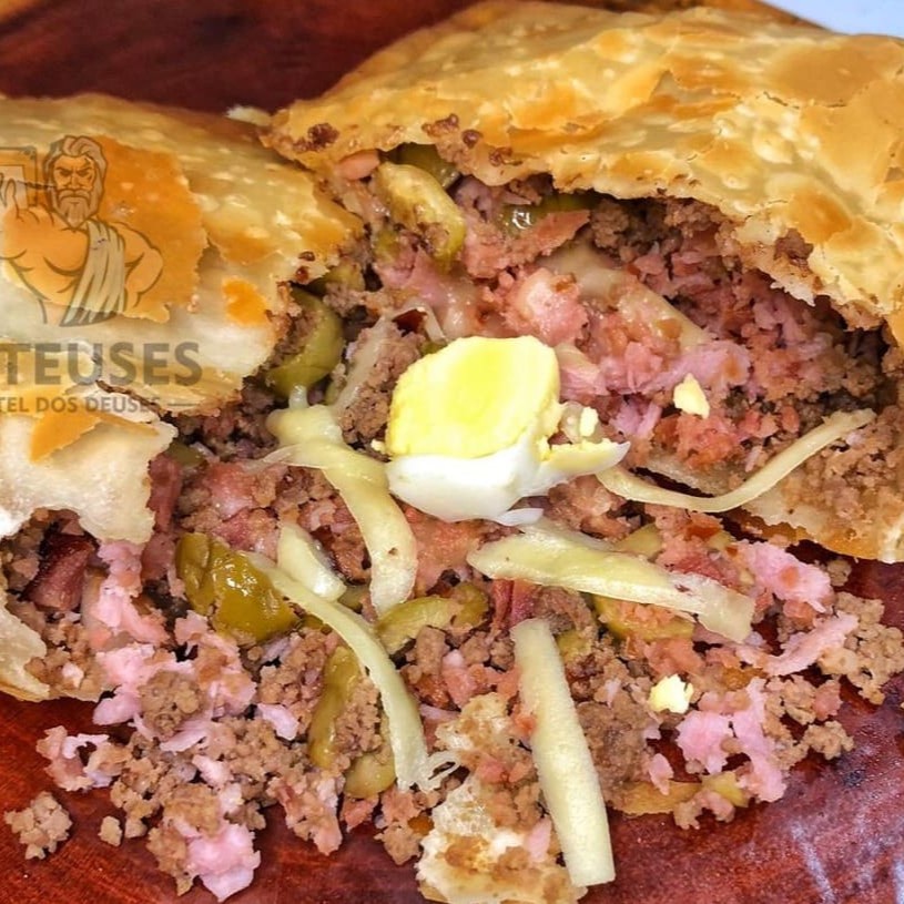 A harmonia perfeita entre o ferreiro divino e a deusa do amor em uma explosão de sabor no pastel Hefesto (calabresa e queijo) e o pastel Afrodite (banana, canela, leite condensado e queijo).