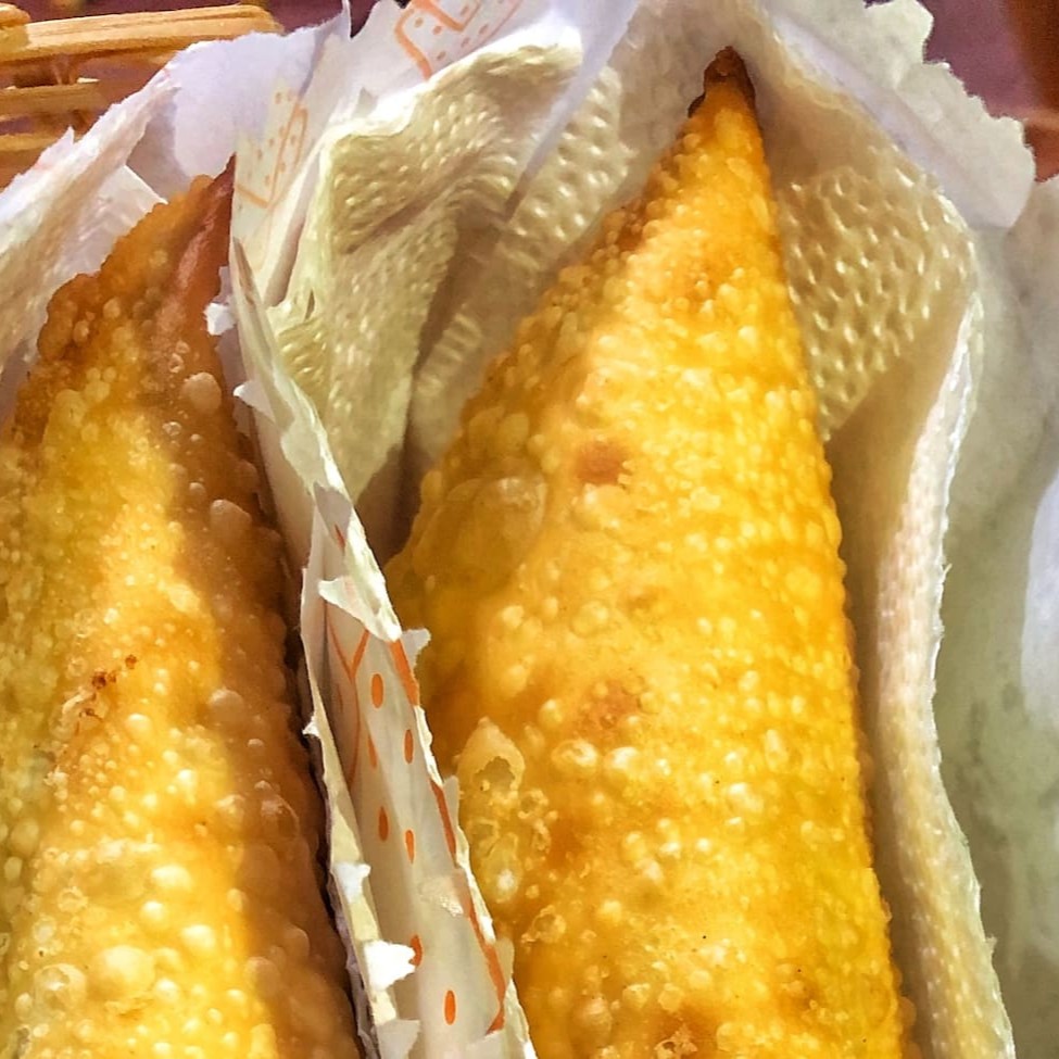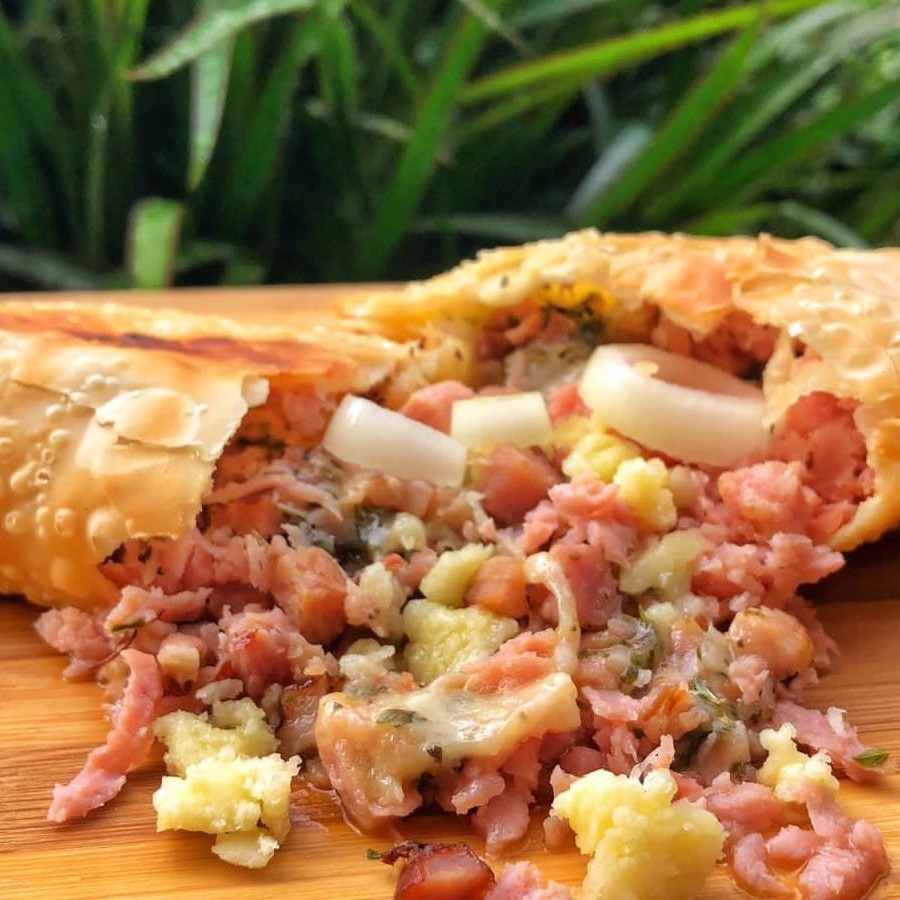 Pastel de carne seca desfiada, Catupiry Original e banana da terra frita.