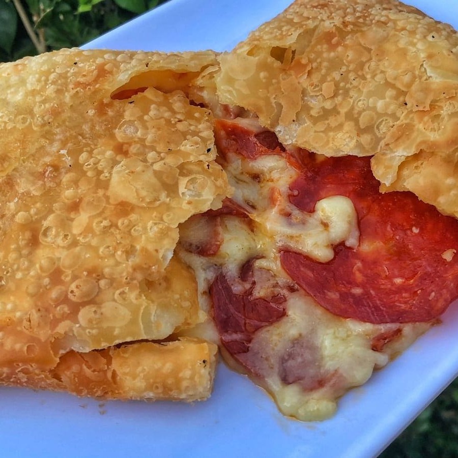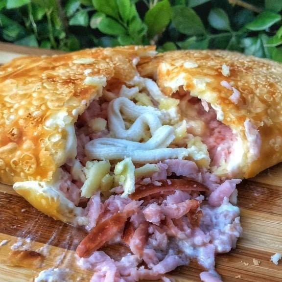 Pastel de pepperoni em rodelas e queijo mussarela.