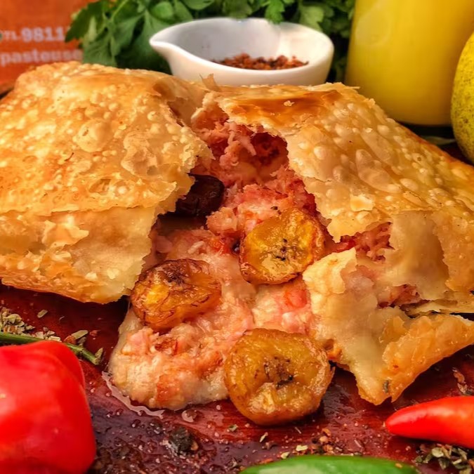 Pastel de fumeiro desfiado, queijo coalho e banana da terra frita.