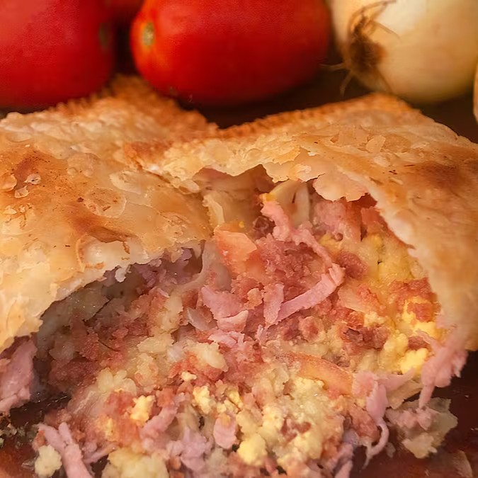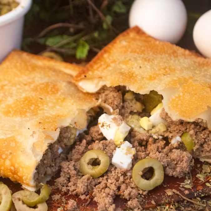Deliciosa carne moida da casa, azeitona, ovo, tomate e queijo mussarela derretido.