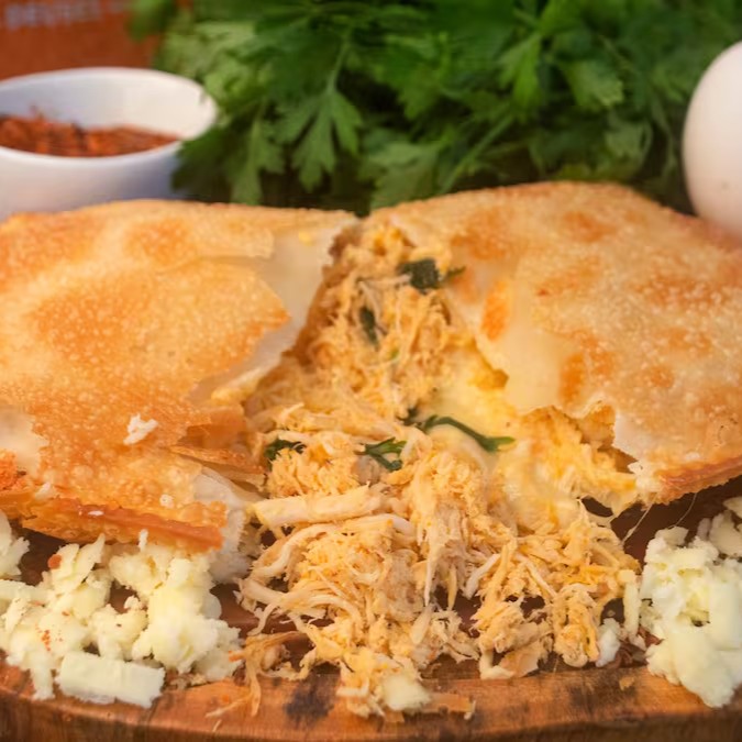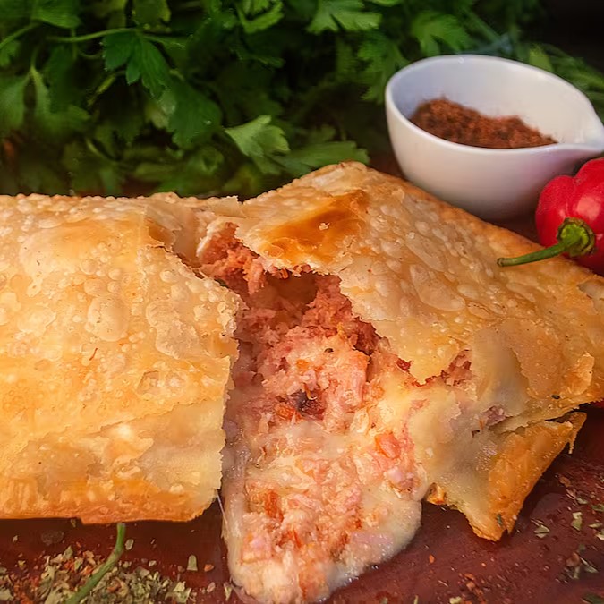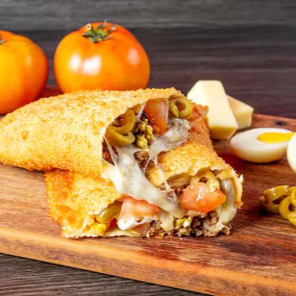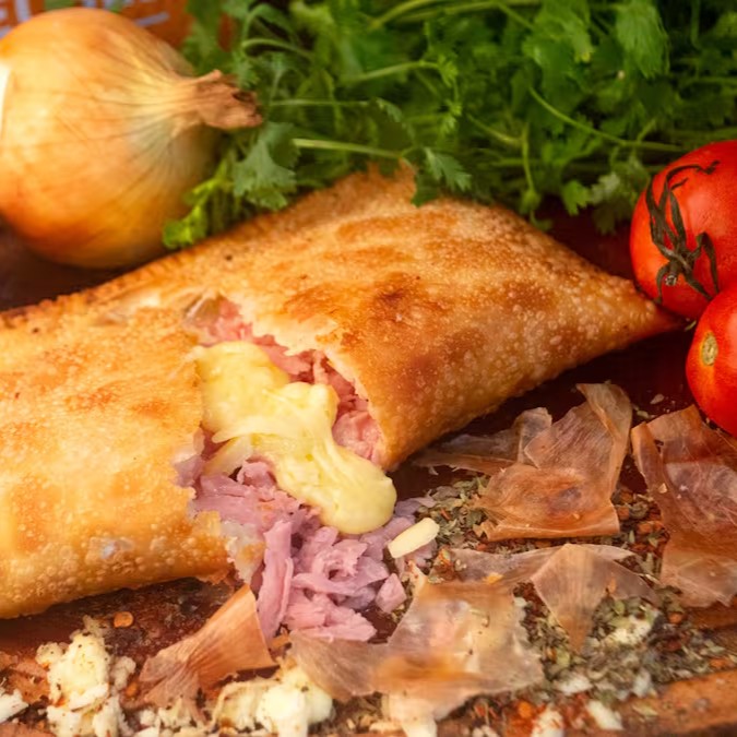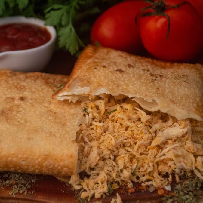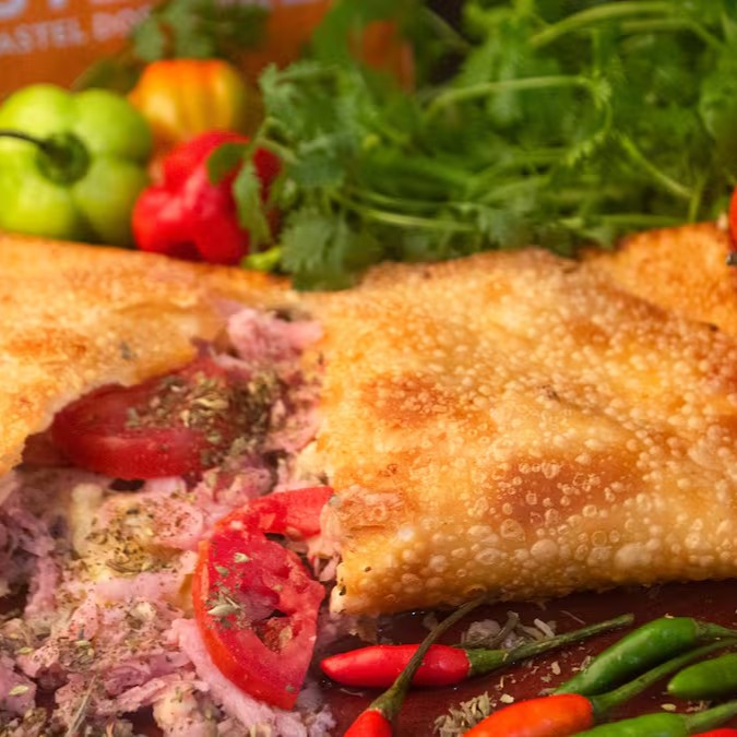 Recheado com frango desfiado e temperado, azeitona, ovo, tomate fresco e queijo mussarela derretido, o Mega Pastel de Frango é uma explosão de sabores clássicos em tamanho extra. E claro, nossa massa é super sequinha e crocante, sem nenhum ingrediente de origem animal, garantindo uma textura irresistível – mesmo no delivery!