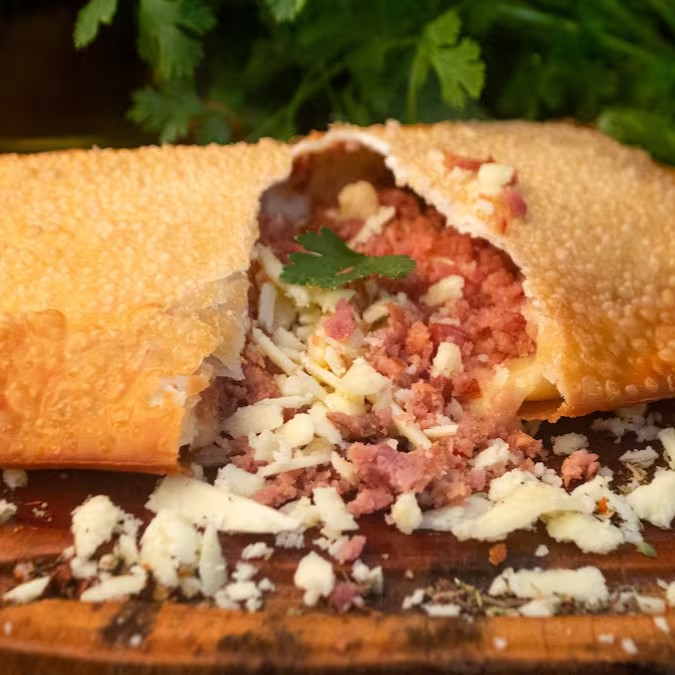 Pastel de fumeiro desfiado com queijo coalho