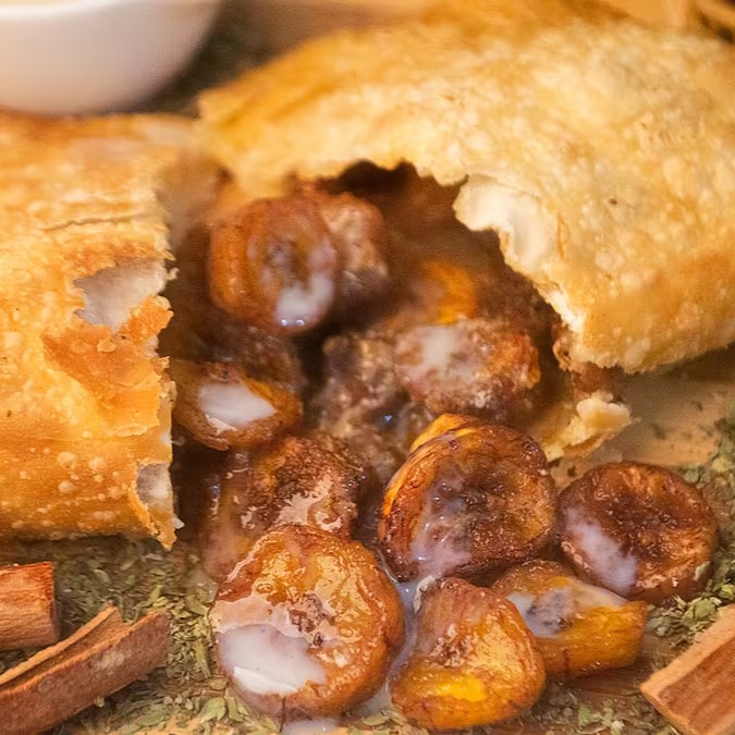 17 cm de pastel de banana da terra frita, canela, leite condensado e queijo.