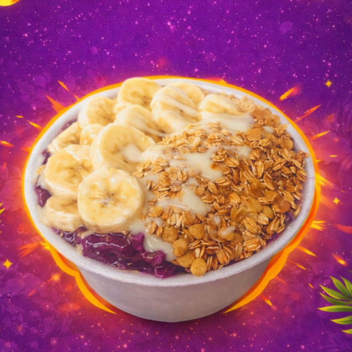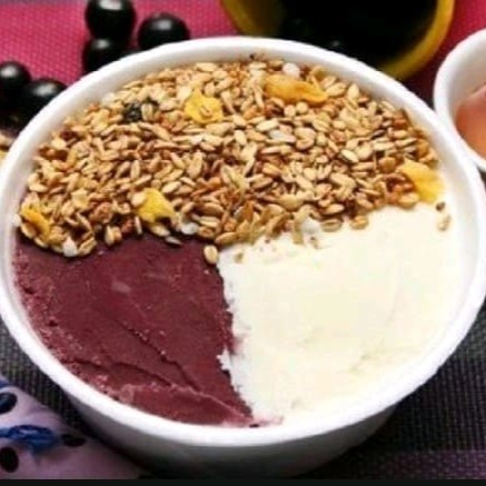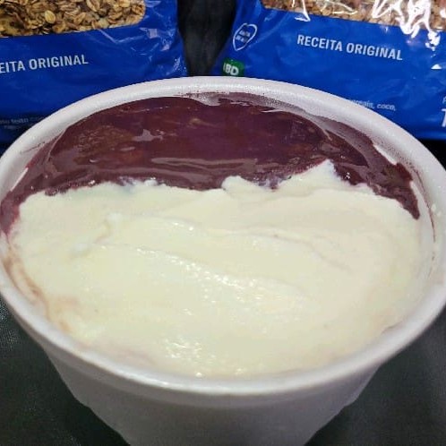 Meio açaí meio creme de cupuaçu. Acompanha granola.
