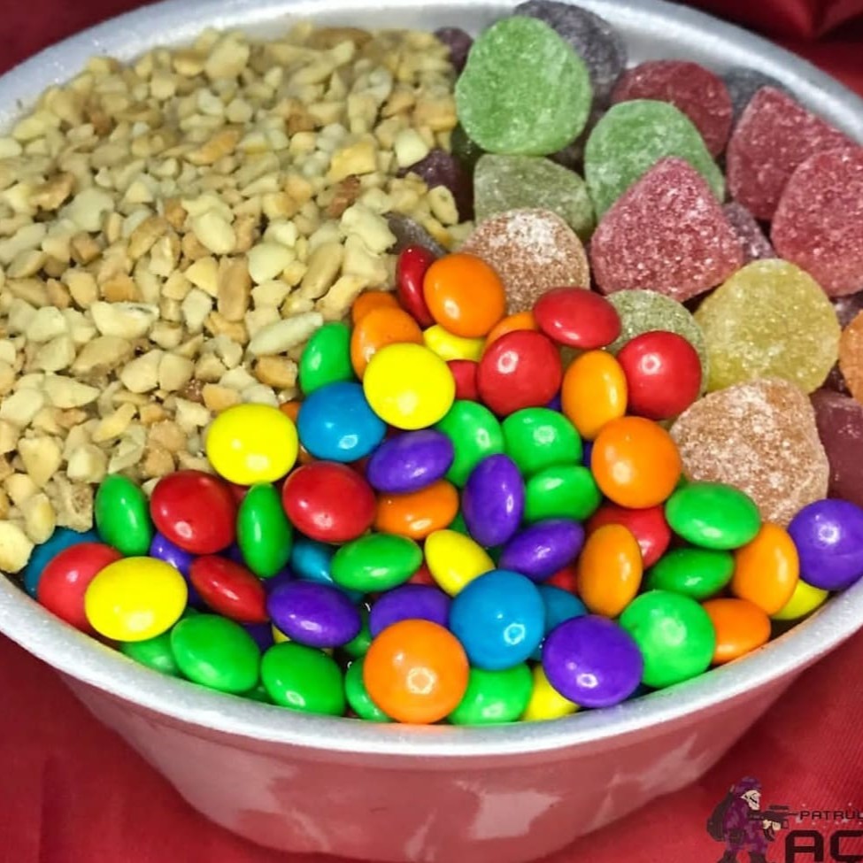 Acompanha disquete, gotas de chocolate, leite condensado e amendoim.