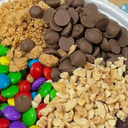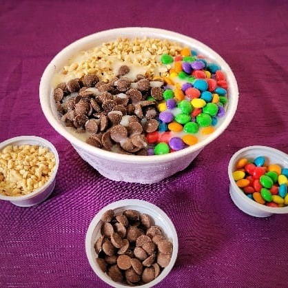 Acompanha Ovomaltine, granola, paçoca e leite condensado.