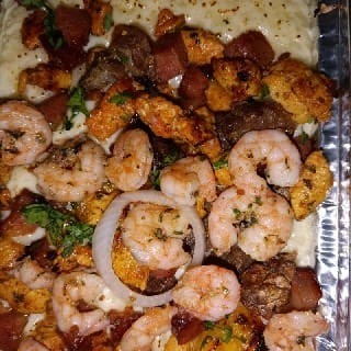 Pirão+Carne do sol+ calabresa+camarão +queijo coalho maçaricado+frango+banana da terra+batata palha.. Obs: salada vinagrete opcional