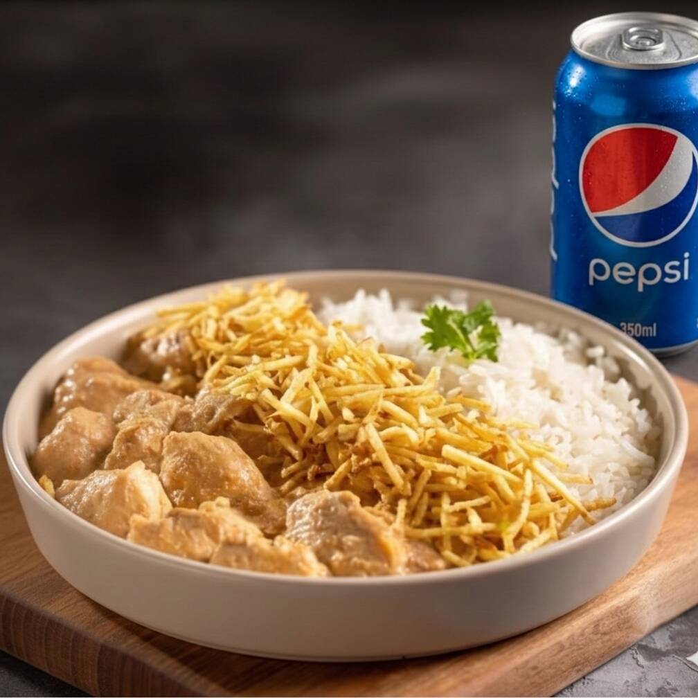 Strogonoff cremoso e bem temperado, preparado com frango macia ao molho especial da casa. Acompanha arroz soltinho, batata frita crocante e uma Pepsi lata bem gelada para completar o combo.