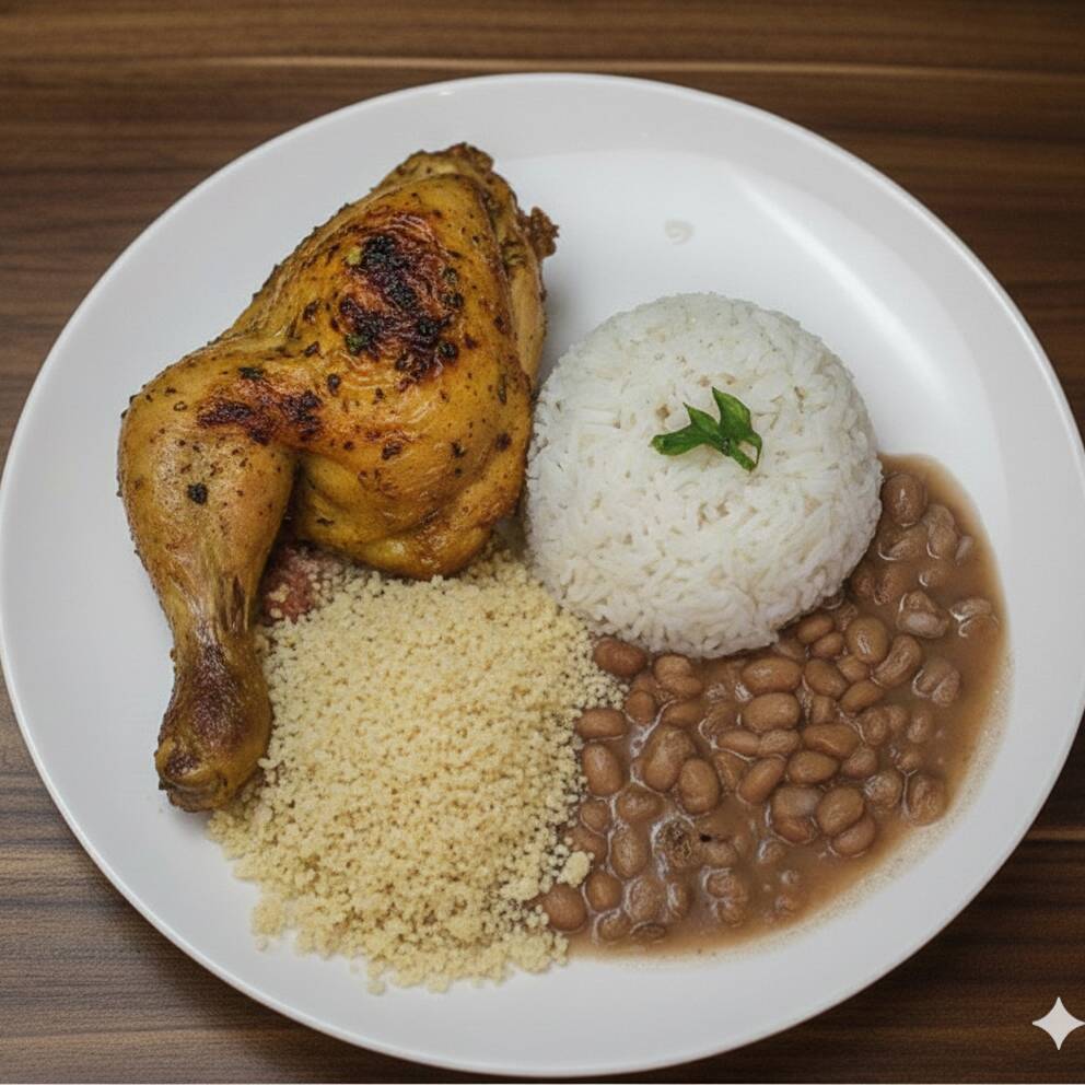 Frango assado dourado e suculento (2 pedaços bem servidos), arroz branco soltinho, feijão de caldo bem temperado e farofa da casa fresquinha para finalizar.