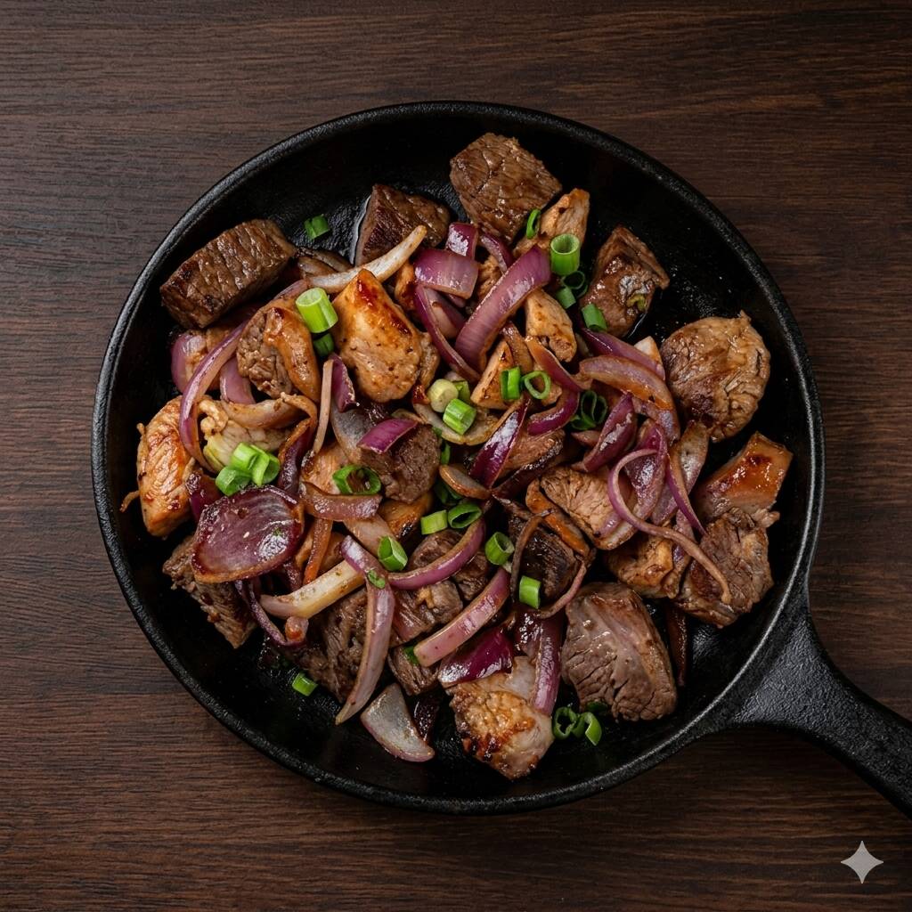 Fígado bovino macio e bem temperado, grelhado no ponto certo e finalizado com cebolas douradas que realçam o sabor do prato. Acompanha dois pedaços de proteína e acompanhamentos à escolha do cliente.