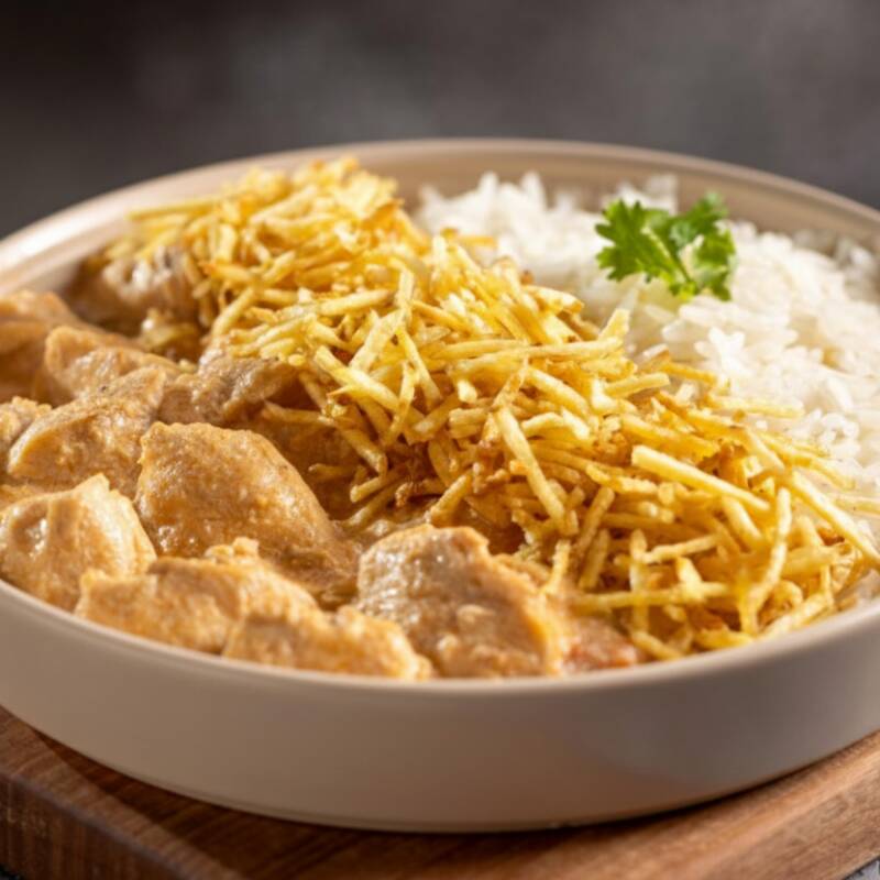 Delicioso strogonoff de frango preparado com pedaços suculentos de frango, envoltos em um molho cremoso e bem temperado, feito na medida certa para agradar todos os paladares.