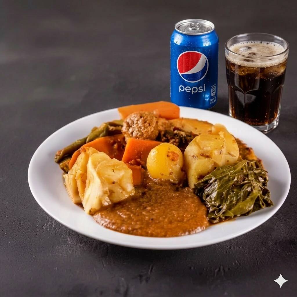 Cozido caseiro bem temperado, com carne macia e legumes selecionados, servido com arroz soltinho, feijão de caldo saboroso e farofa da casa. Acompanha uma Pepsi lata bem gelada para completar a refeição.