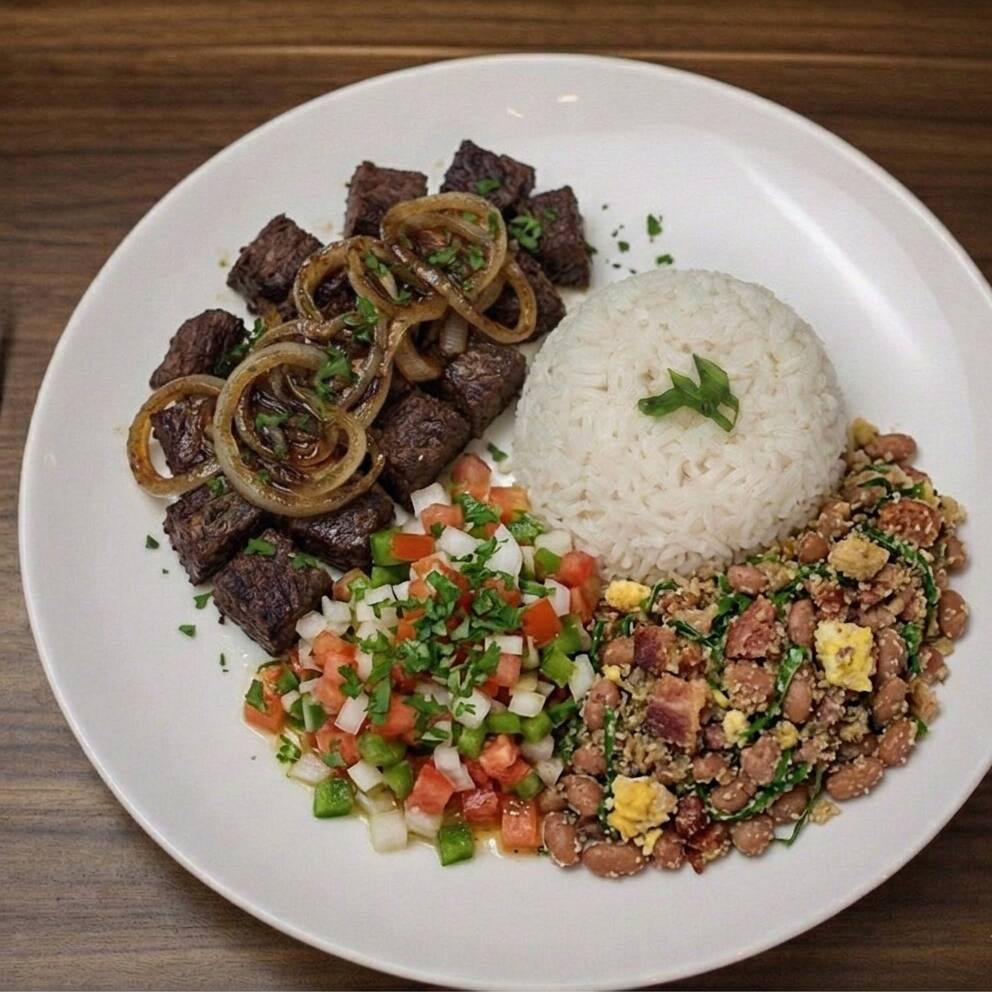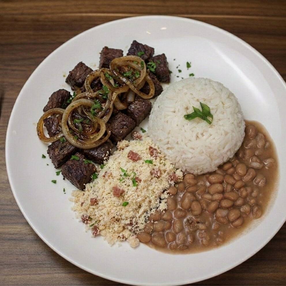 Carne do sol acebolada, suculenta e bem temperada, servida com arroz soltinho, feijão tropeiro bem caprichado e vinagrete fresco da casa. Um prato com sabor marcante e identidade