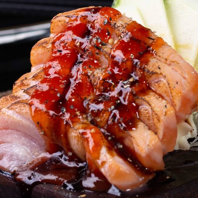 5 Lâminas de Salmão maçaricado um toque de geleia de rubras, molho teriaki, gergelin torrado.