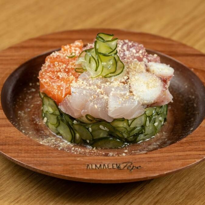 Mix de cubos de salmão, atum, peixe branco, polvo e camarão marinado no molho especial cítrico, cebola roxa, pimenta siracha, moljo de ervas, sal, finalizado com cebolinha.