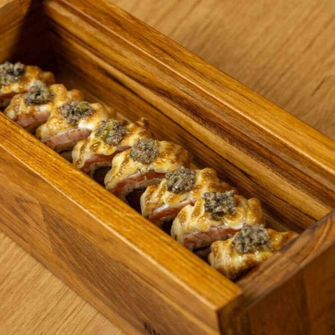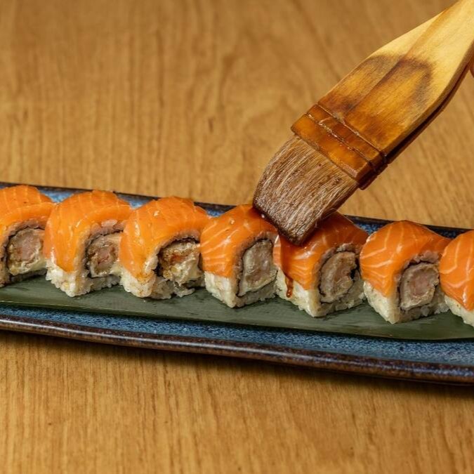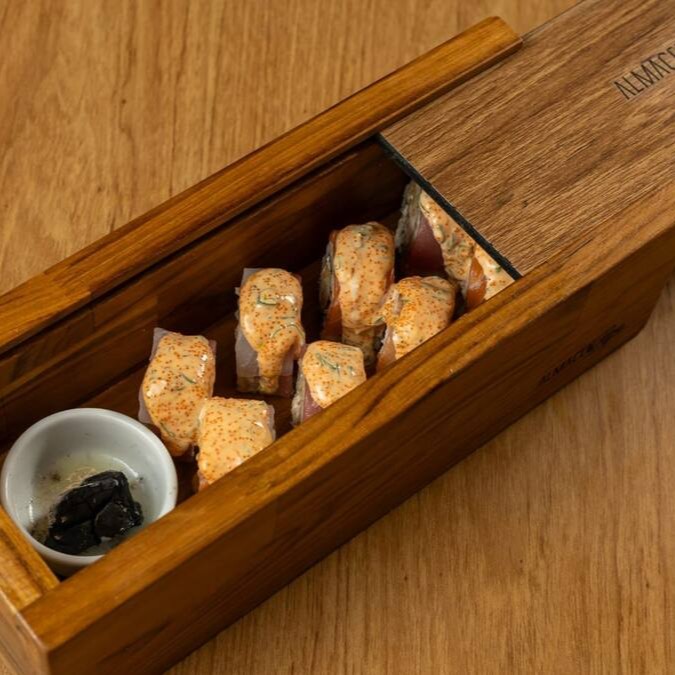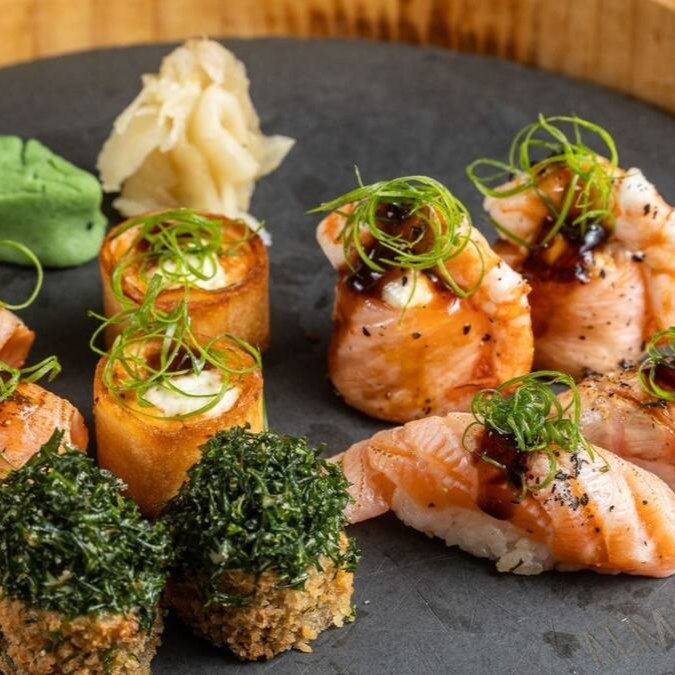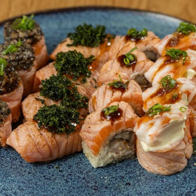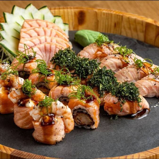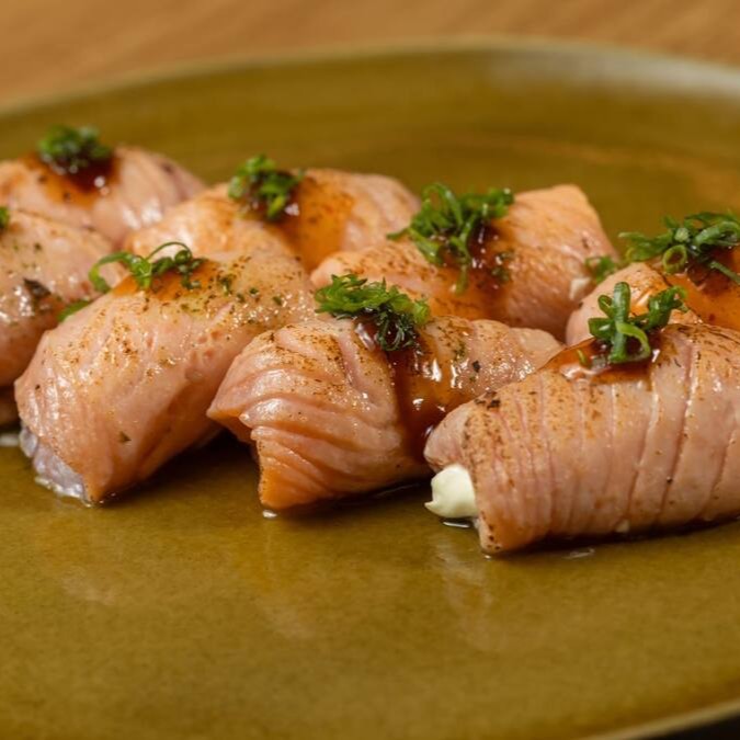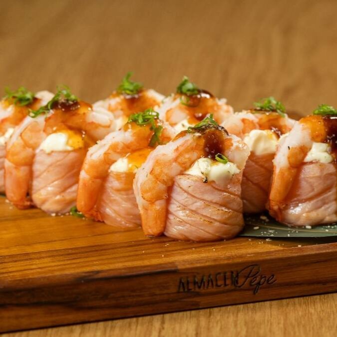 Camarão empanado na farinha panko, envolto em lâmina de salmão maçaricado, cream cheese e molho especial