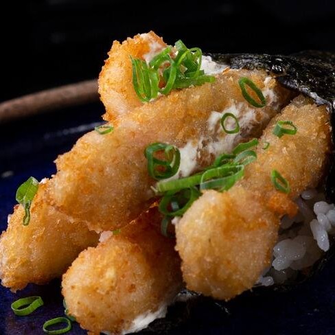 Delicioso camarão empanado na farinha de panko e frito, arroz, cream cheese e cebolinha enrolado na folha de alga marinha desidratada.