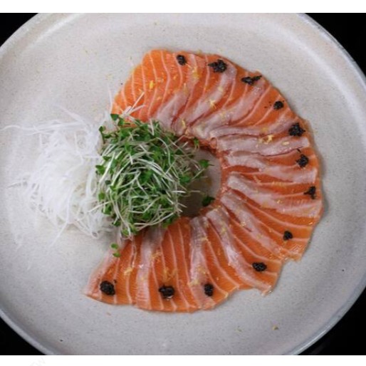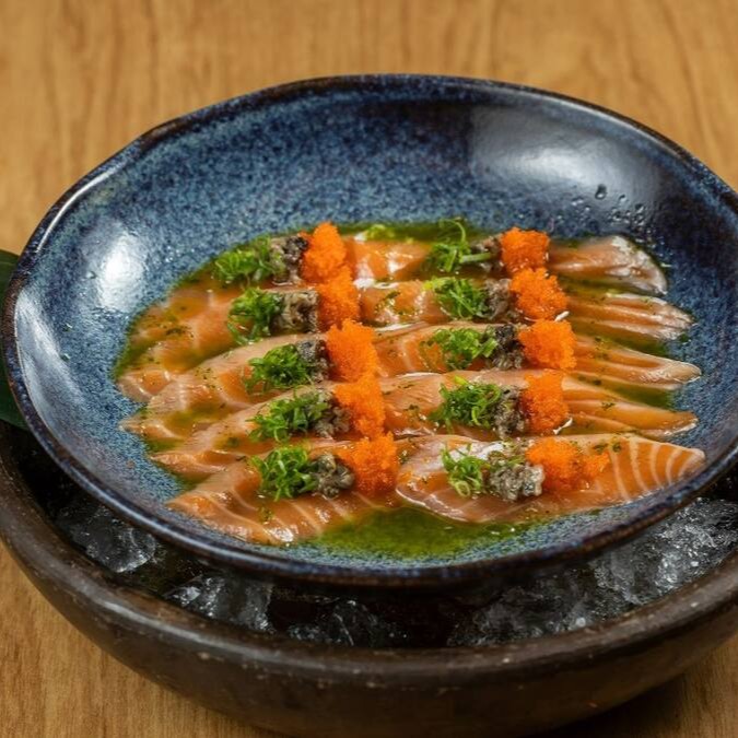 10 lâminas de salmão fresco, temperado com azeite trufado, salsa trufada, ovas de massago e raspas de limão siciliano.