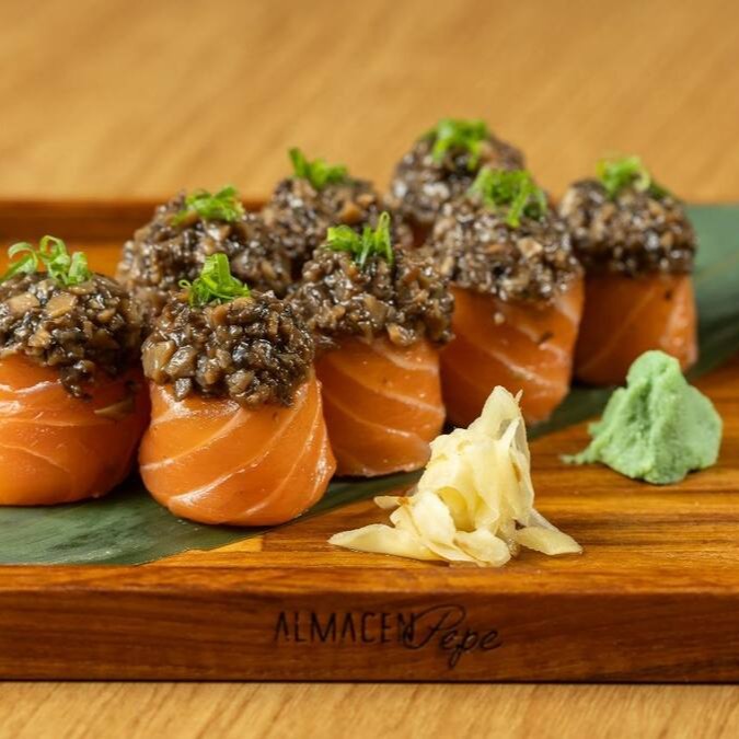 Lâmina de salmão envolvendo arroz japonês recheado com shimeji.